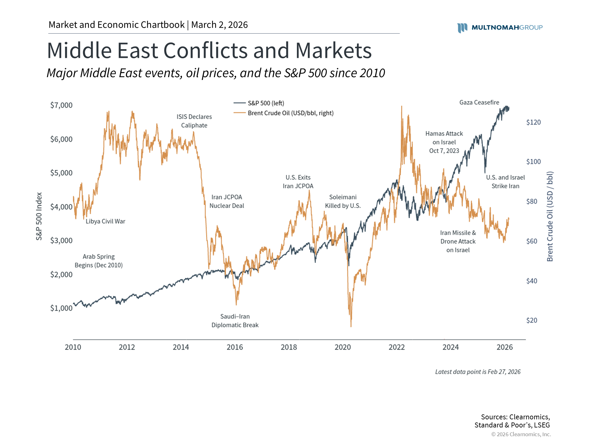 The situation continues to develop rapidly, and the well-being of civilians in the region and U.S. troops remains the foremost concern. Without diminishing the gravity of these events, investors will understandably have questions about the implications for markets, oil prices, and their portfolios.
