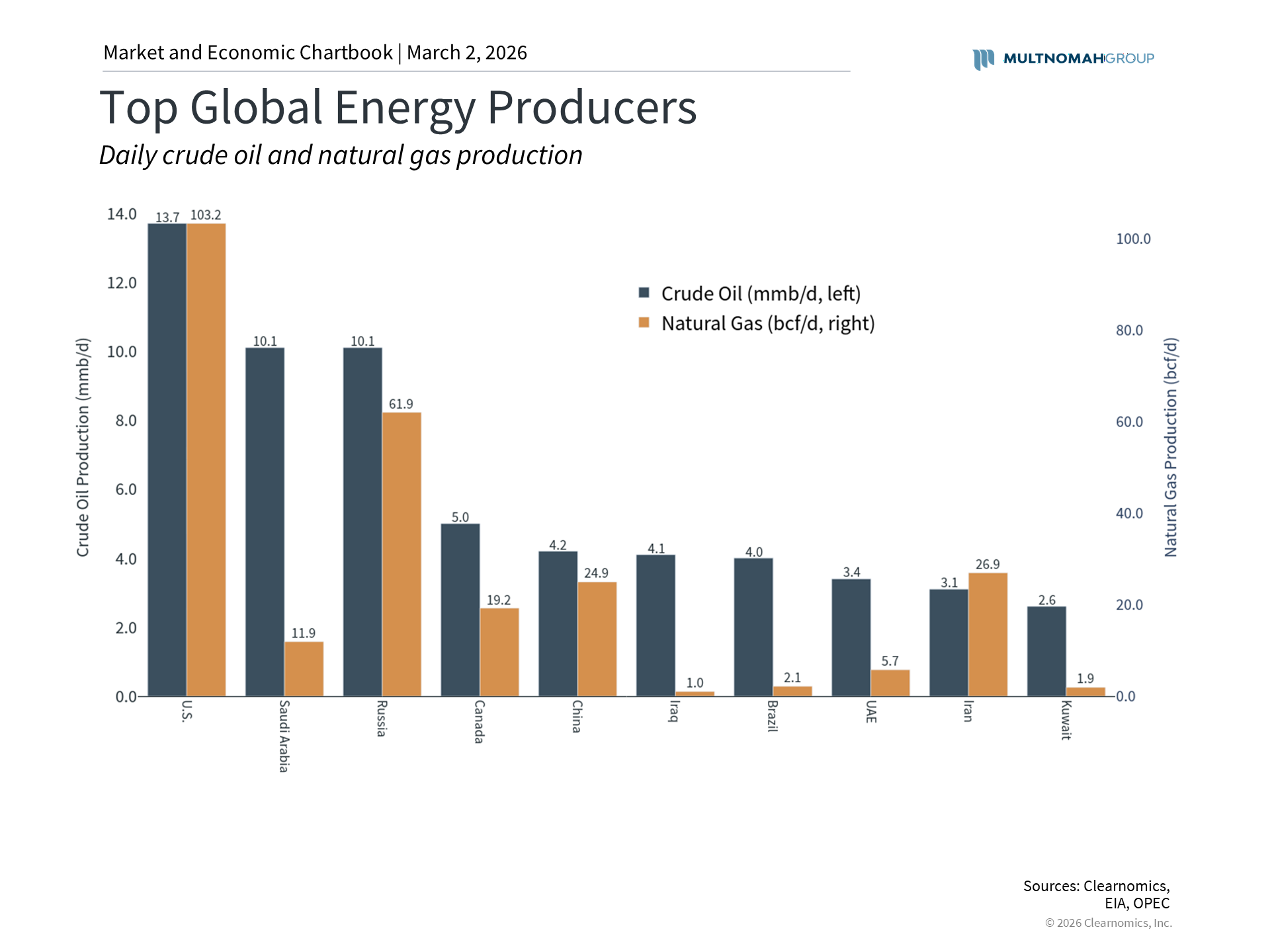 Some perspective is worth keeping in mind, however. Current oil prices remain well below the 2022 peak of nearly $128 per barrel reached when Russia invaded Ukraine. The current environment is also notably different. Since 2018, the U.S. has been the world's largest producer of oil and natural gas, with domestic output surpassing that of other major producers such as Saudi Arabia and Russia. While the U.S. still participates in global energy markets, this level of domestic production helps shield the economy from supply disruptions.